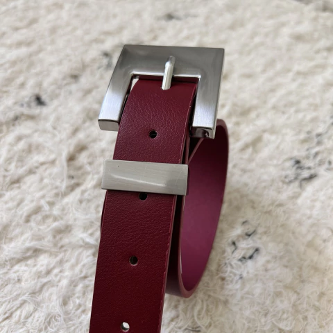 - Cinturon cuero ecologico color bordo con hebilla metelica color plateado.