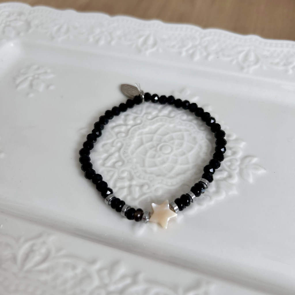 - Pulsera de cristales de vidrios facetados + piedras agata + hematites + dije central de nácar con forma de estrella